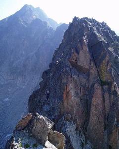 La cresta... se ha de escalar y trepar bastante... pocos "reposos"... mucho de todo... pasos aéreos... destrepes curiosos y en equilibrio... la roca inestable en algún tramo... un par de rápeles.... el famoso diedro con el clavo y placa fisurada para llegar a la R ( IV +) mucho III + y cresta...y más cresta... Llegabamos a la cima a las 6 de la tarde.