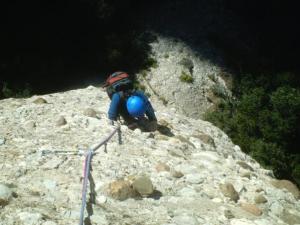 El primer llarg està equipat amb químics, encara que podem reforçar amb un alien groc (no hi entra massa cosa més). L´escalada és fineta i cal fer servir la intuició per trobar els passos (mig metre a l´esquerra o mig a la dreta). IV+, V, V+, V- (35m)