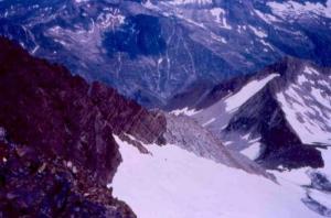 Mirando hacia abajo desde la arista (se ve el nevero del Bardamina):