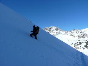 Aquest diumenge 6 de Febrer vam anar al Montmalus pel corredor NO. Sortin de les pistes de Garu Roig, un cop vam deixar les pistes vam seguir tot el que vam poder per les roderes de les motos de neu, doncs hi havia molt neu pols, un cop ja no vam tenir-les ens vam haver d´enfonsar per poder avançar, ens alguns trams fins a un parell de pams. Un cop a la canal la neu estava millor hi et permetia avançar sense problemes, la qualitat de la neu en el corredor era prou bona, pero no n´hi havia gaire, concretament en el tros del mig era escassa, hi si començaven a veures les pedres, aqui podeu veure una panoràmica de 360 º des de el cim.
