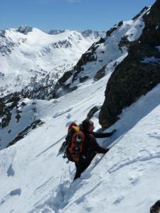 Aquest passat diumenge 20 de març vam anar al Pic Baix del Cubil, sortint de Les bordes d´Envalira i seguint les pistes de Grau Roig fins a arribar a la base del Pic, ja pujant ens havíem fixat en una petita canaleta o pala inclinada, d´uns 150 metres,  que hi ha a la dreta de la base del cim. Aixi doncs per fer-ho una mica diferent vam pujar per aquesta canaleta que ens deixa just al començament de la zona que a l´estiu es una petita grimpadeta, i desde aqui fins al cim, per baixar ho vam fer per el llom normal. La neu fins a la base era abundant, i tot i que no es agradable anar per el costat de les pistes, també es veritat que aixo facilita la pujada, a la canaleta hi ha havia trams de tot, primer toveta, algun tram glaçada i algun tros escassa degut a algun allau, pero en definitiva estava força acceptable, millor del que ens esperàvem.