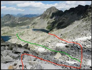 Hay 3 opciones de bajada, en esta foto se ven las 2 que conectan con el camino de subida a la altura del estany de Ratera de Colomers, nosotros utilizamos la marcada en verde.
