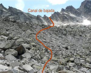 Decidimos bajar por aquí para evitar el largo y pesado flanqueo hasta el Portau de Colmers, se gana algo de tiempo, duro es prácticamente igual ya que la bajada por la canal hay que hacerla con precaución por su inclinación y por encontrarte varios bloques inestables.
