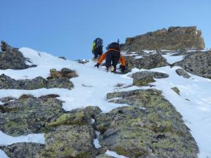 Volíem pujar des de el ref. de Juclar, pero una mica abans vam veure una canaleta que semblava que pujava a la carena i ens hi vam enfilar. No teníem informació prèvia d’aquesta canal, pero ens va sembla prou interessant. Es tracta d’una canal  curteta, uns 100 m, i d’una inclinació de 45º, i que acava en una cresteta amb una vista impresionant, mes endavant vam trobar un espero força dret que ens va complicar el tema, un cop superat aquest,  la cresta es fa mes complicada i com que ens hi havíem posta tard, ho vam haver de deixar sense fer el tram final i el cim , tot i que nomes quedavam uns pocs metres.