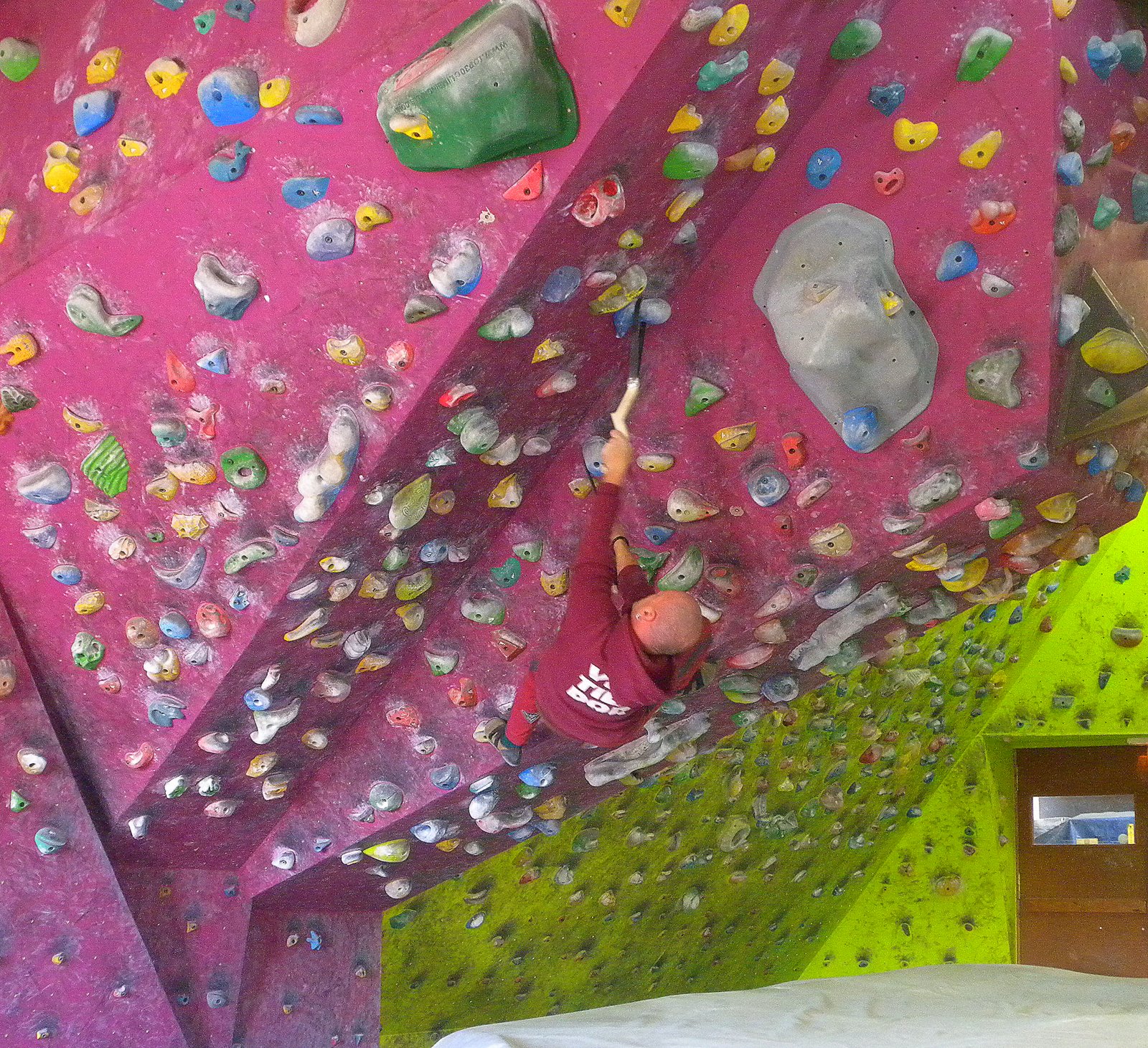 2.- Otra opción es buscar amigos que se dediquen a la tala de árboles, y antes de cortarlos ,te permitan subir por ellos... aunque alguna vez reconozco haberlo hecho en los postes de madera de tendido telefónico.. ( si vives en algún pueblo, seguro en algún rincón "alejado", encuentras alguno donde poder "desahogarte" 3.- Está es de las mejores... la gente de Alpkit comecializa un "invento" muy conseguido... ( hace justo un año que consegui unos ) Una imitación en madera ligera del mango de los piolos técnicos, con una goma rigida tipo "correa de engranajes", con lo que no has de "clavar" nada, sino simplemente "lazar" las presas del plafón... Son rollo técnico, y se te ponen los antebrazos como piedras... El link del invento y un video...
