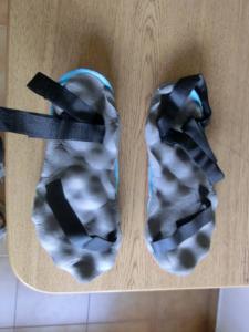 Yo utilizo estas MYOG, el parte superior trozo de aislante de evazote y parte inferior plantilla interior de zapatillas de deporte, cinta de velcro , peso total de las dos sandalias 88gr.