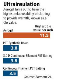Utilizado en los trajes de la aeroespaciales por la nasa, existen chaquetas que incorporan aerogel para expediciones a la Antártida (Spaceloft)